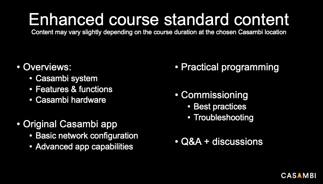 The course includes multiple demonstrations, time for practical network programming, and discussion opportunities with Casambi & other attendees.